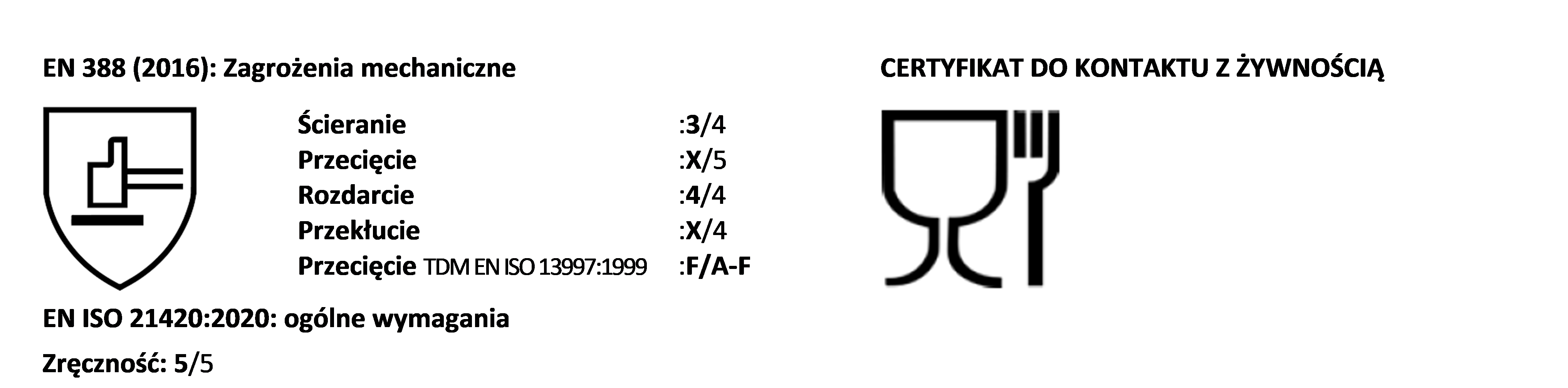 Właściwości zgodne z europejskimi normami: EN ISO 21420:2020, EN 388:2016+A1:2018